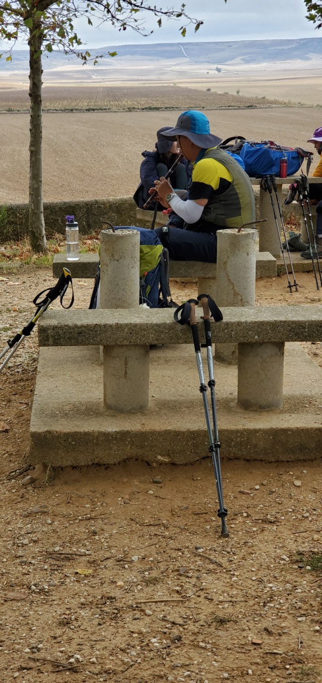 This doctor from Korea does free acupuncture for pilgrims. Then he sat and played a flute These are the special moments on the Camino. And no acupuncture for us! But we watched him stick needles in the hand of a Engkish woman, who was apparently a repeat customer.