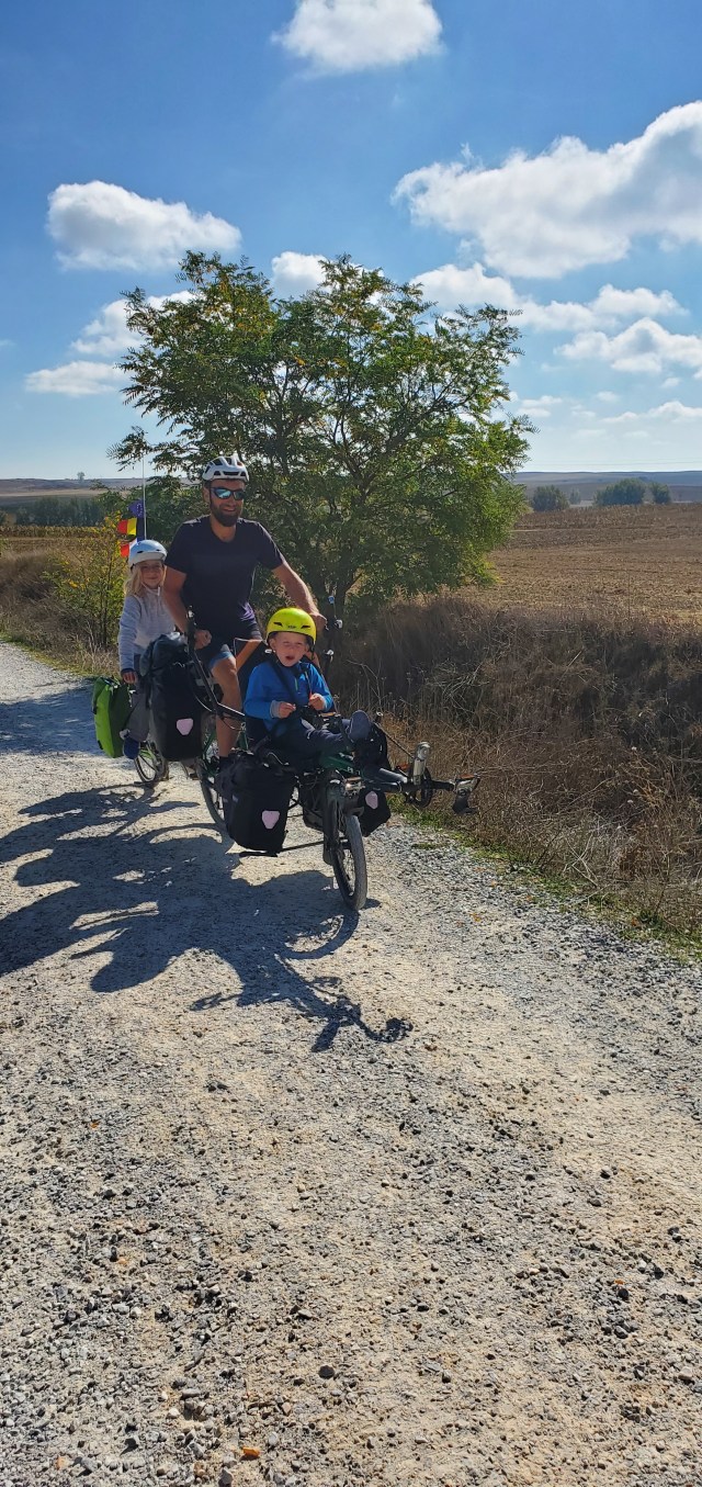 This family of five is biking through Europe for one year. The first bike holds dad and 2 kids (maybe 7 and 4) and the second one (not pictured) had mom and a 10 year old. Ken tipped his hat to her as she pedaled her way to the top of the hill and said he had much respect for her.