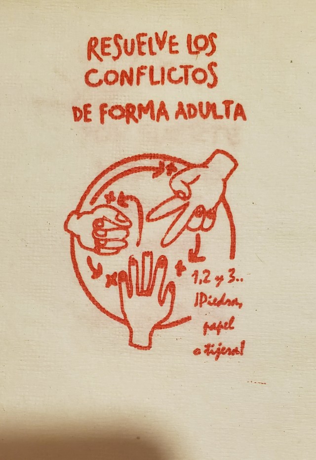 Message on the serviettes in the bar…resolve your arguments like adults…play rock paper scissors! Posted byterryzitnak October 6, 2019 Leave a comment on Message on the serviettes in the bar…resolve your arguments like adults…play rock paper scissors! Share this: Share on X (Opens in new window) X Share on Facebook (Opens in new window) Facebook Like Loading... Related