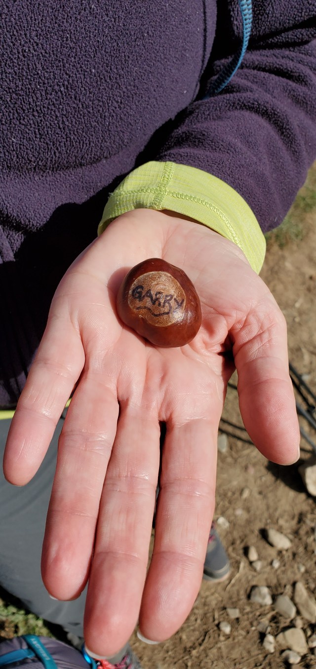 My dear brother (in law) Garry passed away unexpectedly almost 2 years ago. Even in my last moments with him, he talked about the chestnut I had given him when I was 7 and he first started dating my sister. So when this chestnut fell from the tree beside me, I knew it was a gift as well and needed to be carried to the Cruz de Ferro. Buen Camino, Uncle Scare-Bear!