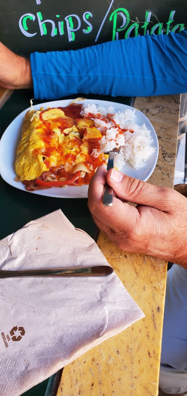 He was making Ken an “egg roll”. Literally, he cooked up cabbage and peppers and bacon, made a rectangle of eggs, then rolled it up.